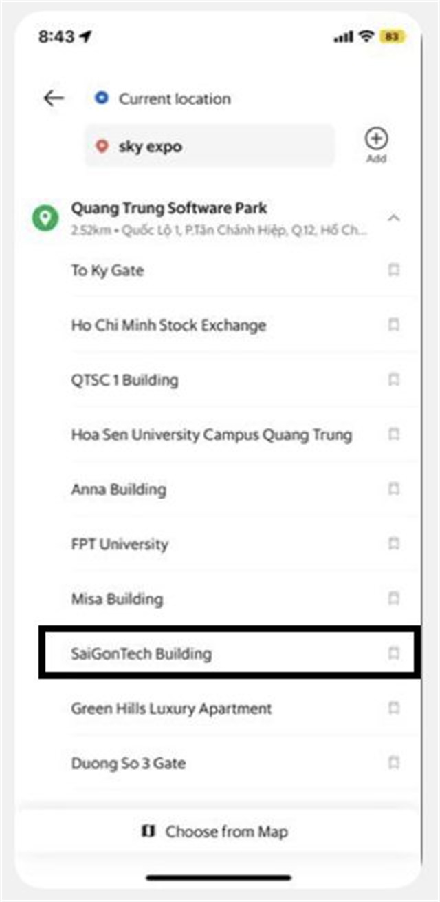 二、可使用當(dāng)?shù)氐某鲂薪煌üぞ呷鏕rab 或 GoViet,可通過手機(jī)下載APP進(jìn)行使用,搜索“廣忠軟件園(Quang Trung Software Park)”,然后選擇“西貢科技大廈(Saigon Tech Building)”作為離入口較近的下車點(diǎn)。