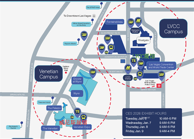 1月5日(周一)至1月9日(周五),部分官方CES酒店提供往返拉斯維加斯會議中心(LVCC)和威尼斯人會展中心(VenetianExpo)的免費班車服務。班車時刻表及參與的酒店,詳見附件。