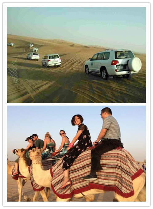 布展結(jié)束,我們展團帶大家體驗了迪拜沖沙 ,在廣闊無垠的金沙攤上,巴基斯坦司機載著大家沙海沖浪,那就一個刺激。平復(fù)心情大家又騎坐在高大的溫順的駱駝上,體驗下上世紀(jì)前中東傳統(tǒng)的代步工具—沙漠駱駝,坐在高高的駝峰間,伴隨著駱駝的起臥,心情起伏驚喜不斷,深夜來臨大家不防來點沙漠大part! 和來自全世界的人們在迪拜的星光下,品嘗的美食欣賞歌舞,優(yōu)哉游哉 樂不思蜀。