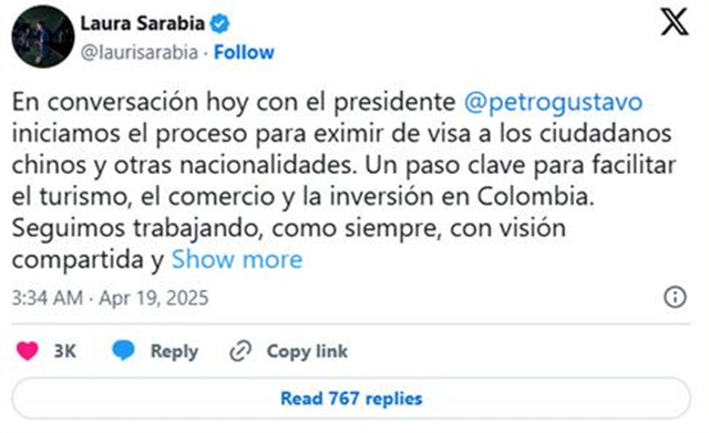 哥倫比亞政府正在考慮對(duì)中國(guó)及其他國(guó)家公民免簽,以促進(jìn)旅游業(yè)和投資。目前尚未正式公布。哥倫比亞外交部長(zhǎng)勞拉·薩拉比亞于4月18日星期五宣布,哥倫比亞政府已啟動(dòng)對(duì)中國(guó)及其他國(guó)籍公民免簽程序。